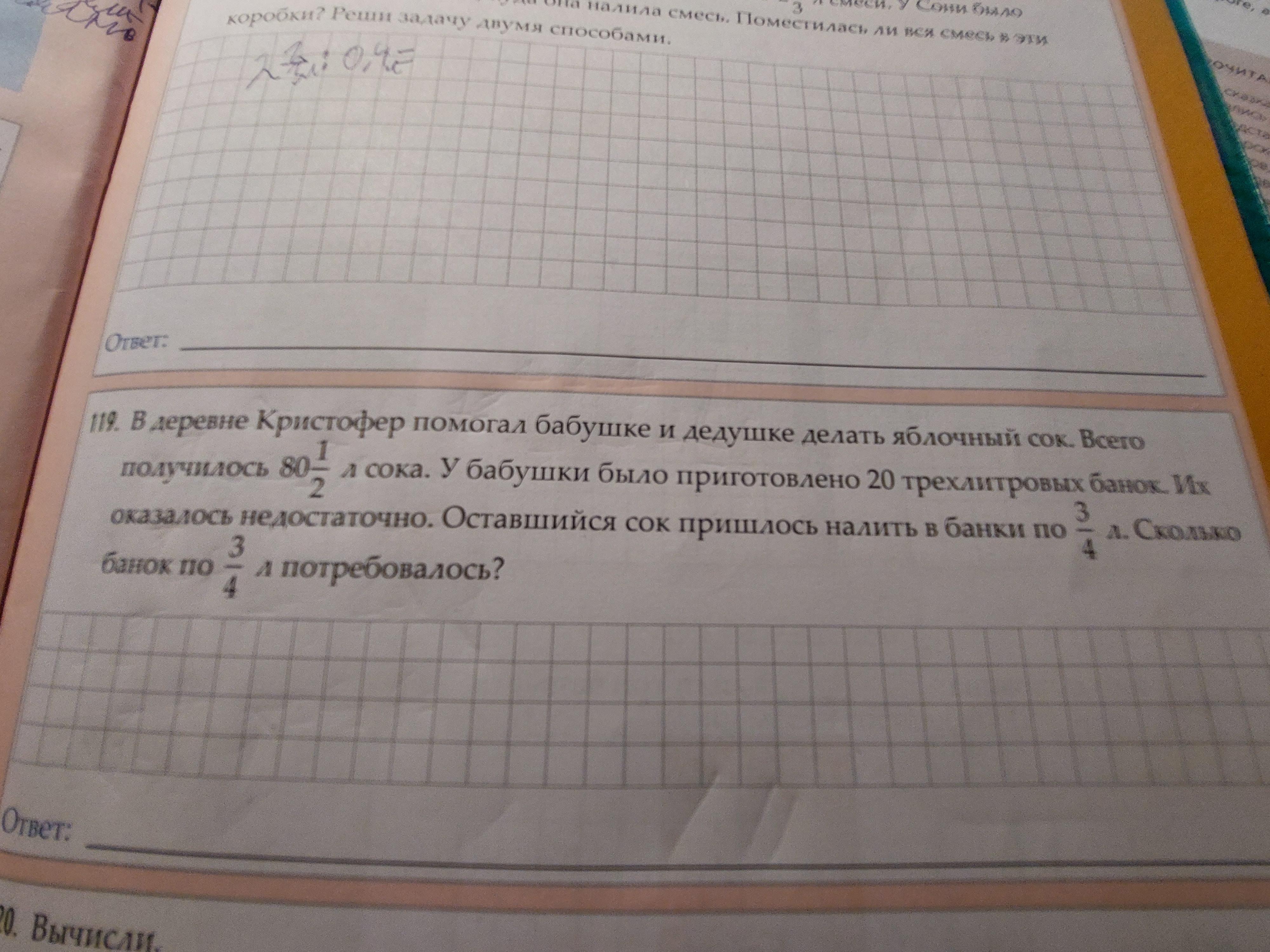 1) 20 * 3 = 60 (л) - ушло на 20 штук 3-ёх литровых банок