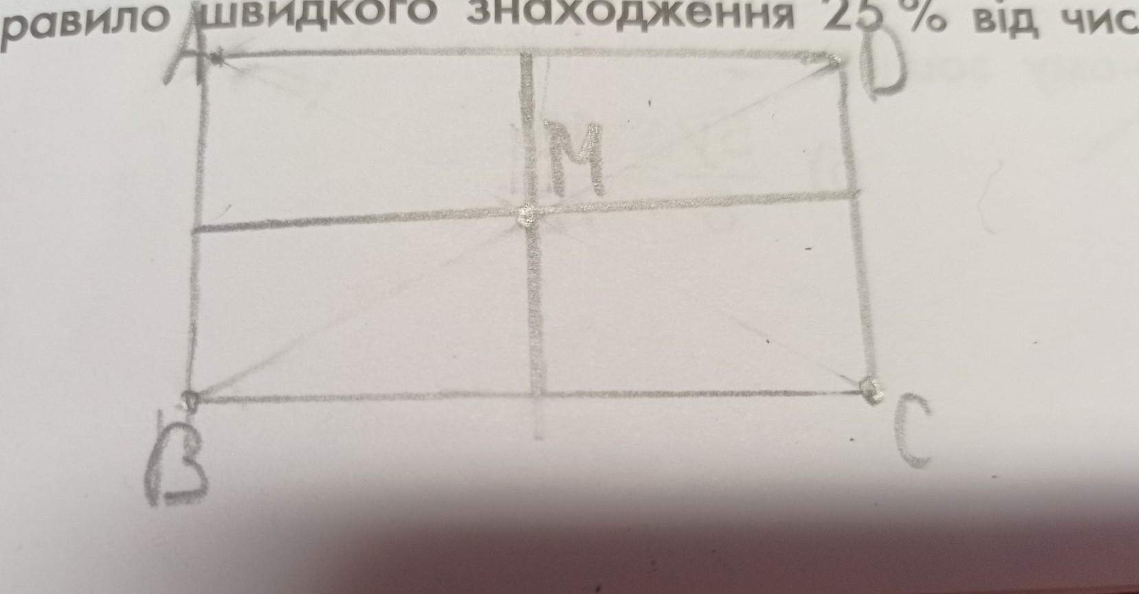 Побудуй прямокутник ABCD. Постав точку м всередині прямокутника. за допомогою косинця побудуй перпендикуляри з точки м до кожної зі сторін прямокутника.