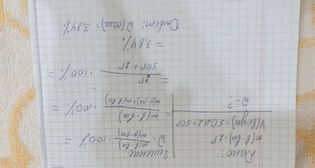 ПОЖАЛУЙСТА ПОМОГИТЕ С ХИМИЕЙ!!! СЕГОДНЯ НУЖНО ПРИСЛАТЬ! СМЕШАЛИ 2 Г СОЛИ И 50 МЛ ВОДЫ. КАКОВА МАССОВАЯ ДОЛЯ СОЛИ В ПОЛУЧЕННОМ РАСТВОРЕ. НАПИШИТЕ ПОЖАЛУЙСТА С ДАНО