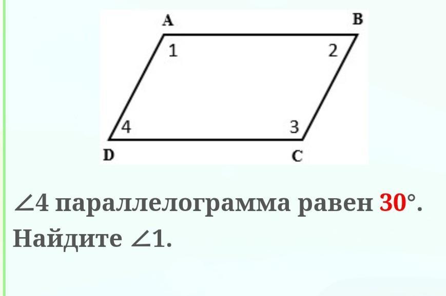 ∠1= 180°- ∠4= 180°- 30°= 150° (так как сумма соседних односторонних углов в параллелограмме равна 180 градусам)