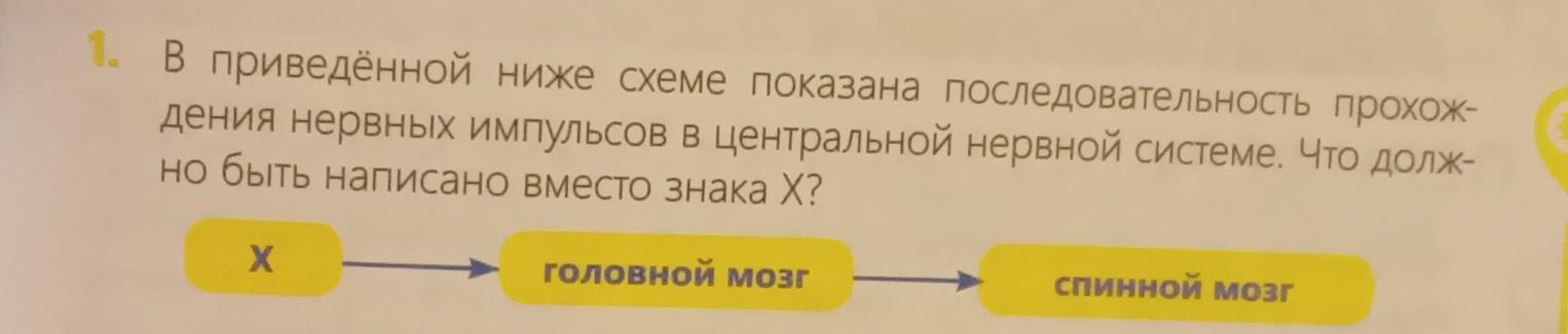 В приведённой ниже схеме показана последовательность прохож- дения нервных импульсов в центральной нервной системе. Что долж- но быть написано вместо знака Х? х головной мозг спинной мозг