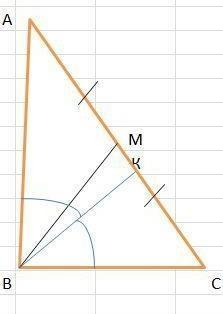 Найдите длину отрезка АМ и градусную меру угла АВК,если ВМ-медиана,а ВК-биссектриса треугольника АВС и известно,что АС=22дм,<АВС=70град