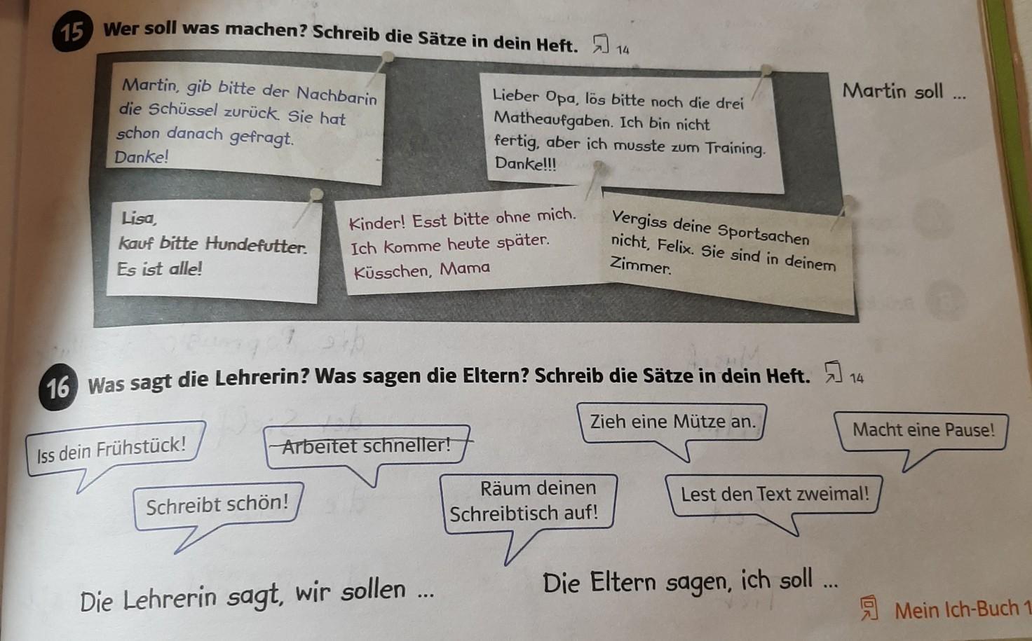 Die Eltern sagen, ich soll mein Frühstück essen, meinen Schreibtisch aufräumen, eine Műtze anziehen