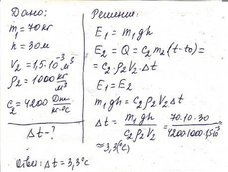 ДАЮ 35 БАЛОВ!!!Людина масою 70 кг піднімається на висоту 30м. На скільки градусів він міг би нагріти воду, об’ємом 1,5 л , витративши таку саму енергію.