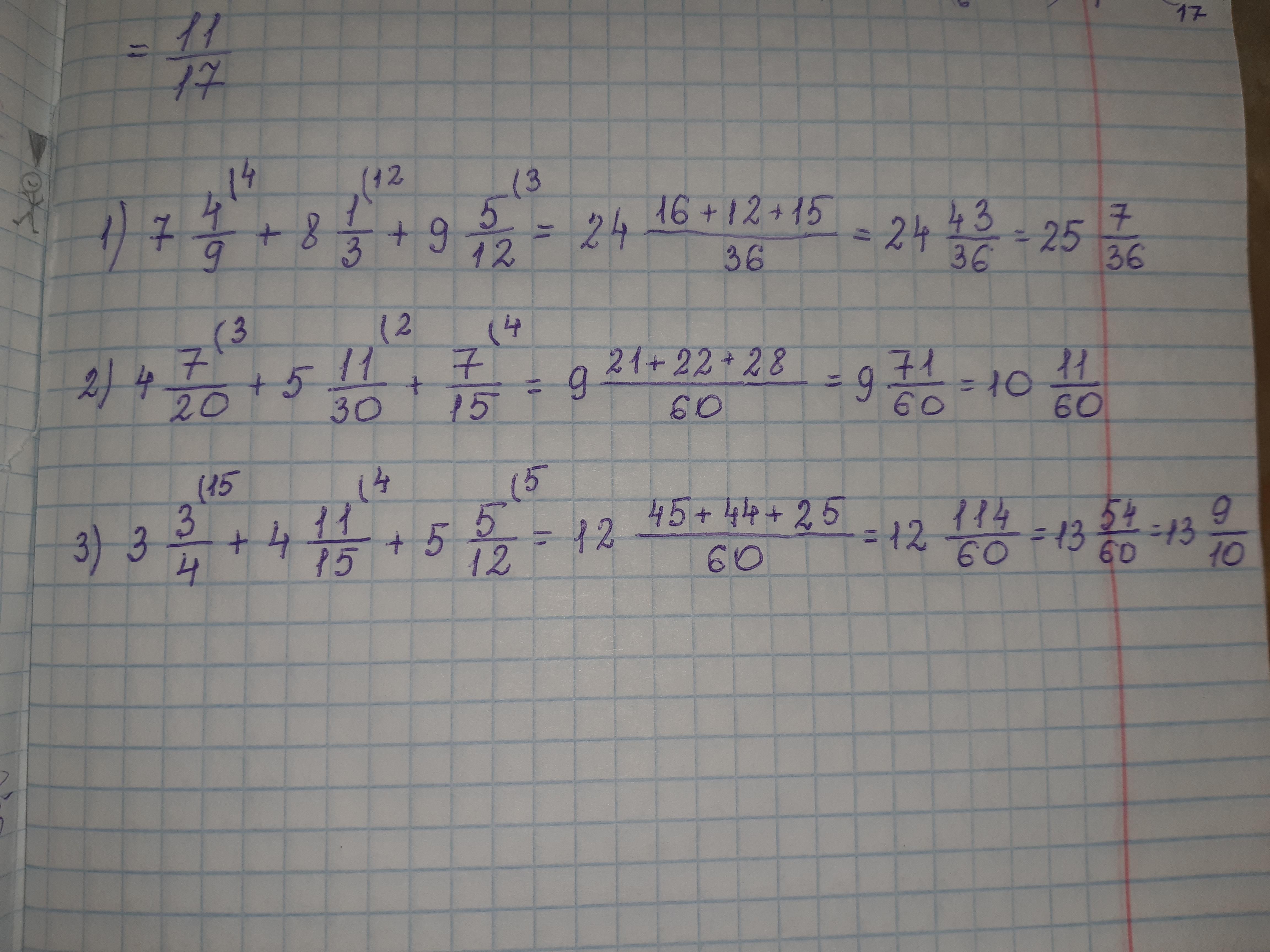 1) 7 4/9+8 1/3+9 5/12; 2) 4 7/20+5 11/30+7/15; 3) 3 3/4+4 11/15+5 5/12,