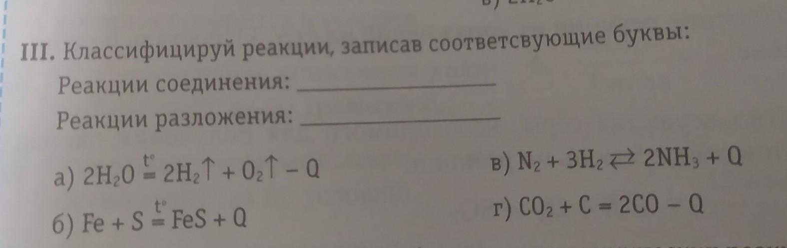 III. Классифицируй реакции, записав соответствующие буквы: Реакции соединения: Реакции разложения: