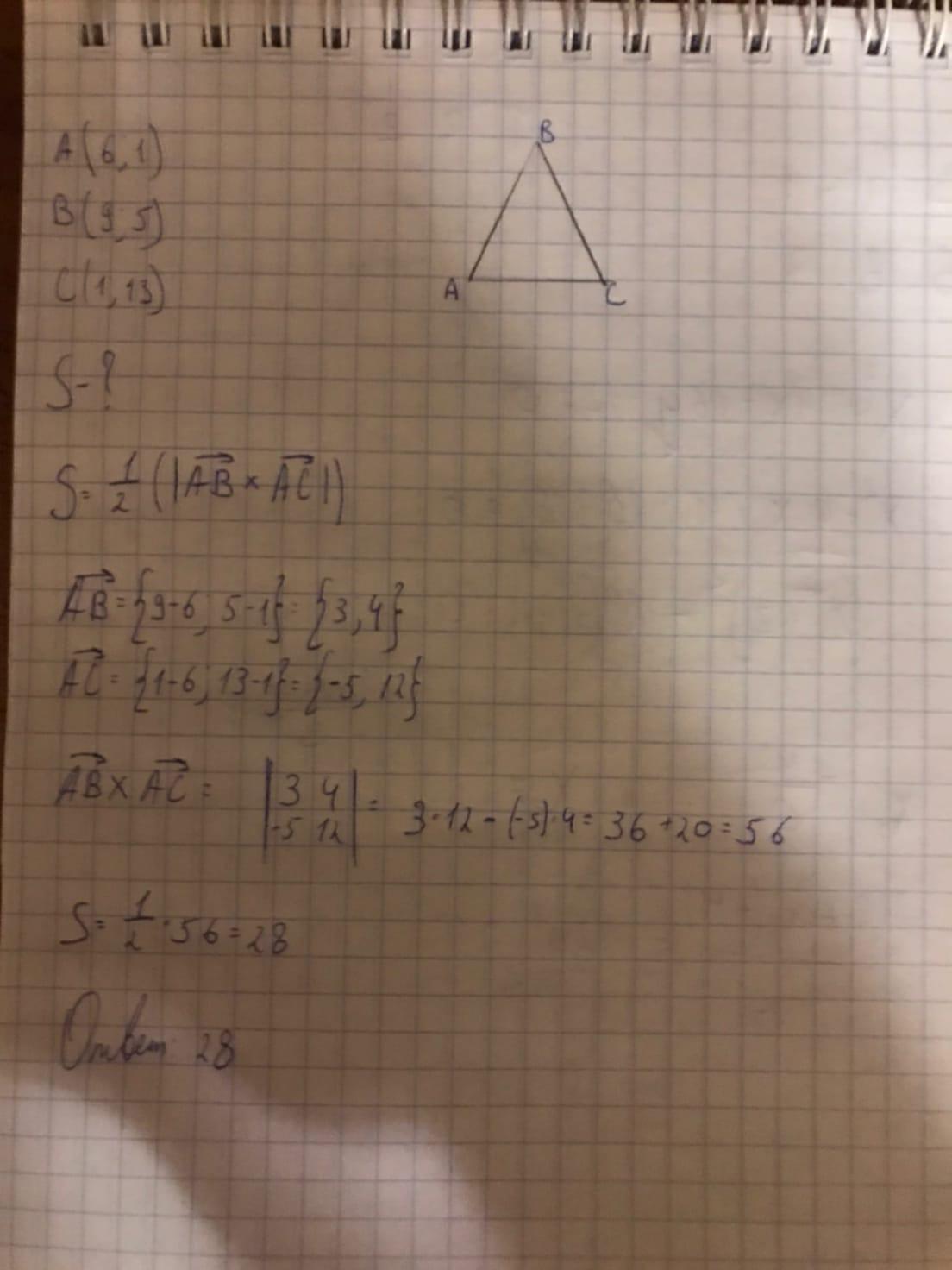 Дан треугольник ABC, вершины A(6;1) B(9;5) C(1;13). Найдите площадь треугольника. ПОЖАЛУЙСТА, ДАЙТЕ ПОЛНОЕ РЕШЕНИЕ. ДАМ 50 БАЛЛОВ.