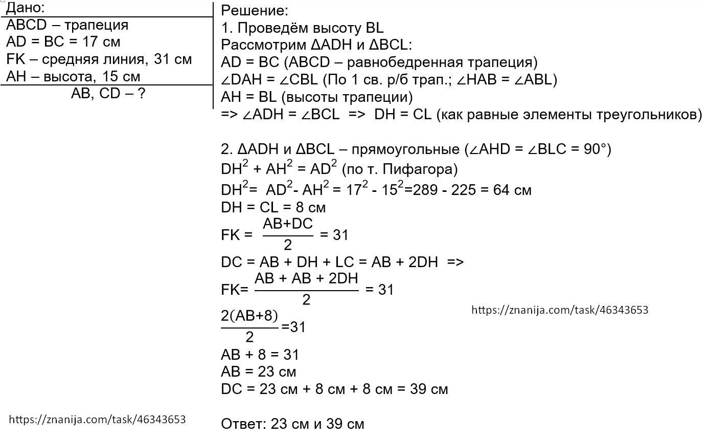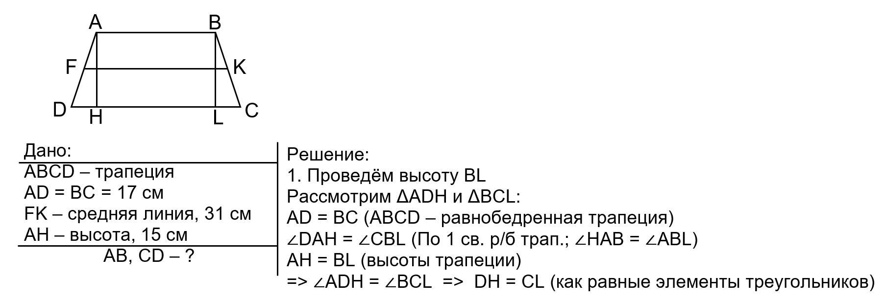 срочно помогите пожалуйста У рівнобічній трапеції бічна сторона 17 см, висота 15 см, а середня лінія 31 см. Обчис- лити основи трапецій