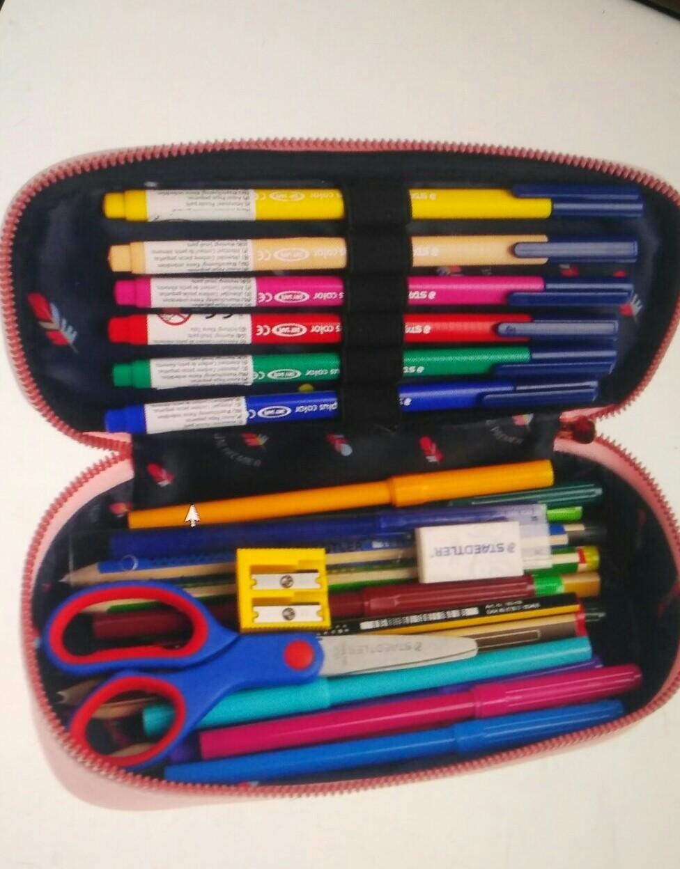in my pencil case I have a lot of supplies.there are many colorful pens .I also have markers , a sharpener and an eraser