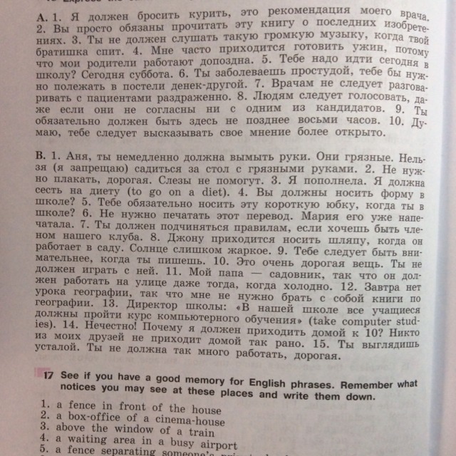 Century 1. Anya, you should immediately wash hands. They are dirty. You cannot (I forbid) to sit at a table with dirty hands. 2. No need to cry, my dear. Tears won't help. 3. I plumper. I should go on a diet (to go on a diet). 4. You should wear uniforms in school? 5. You always wear that short skirt, when you're in school? 6. No need to print this translation. Maria it has already printed. 7. You have to follow the rules, if you want to be a member of our club. 8. John may have to wear a hat when he works in the garden. The sun is too hot. 9. You should be careful when you write. 10. This is a very expensive thing. You should not play with her. 11. My father is the gardener, so it should work on the street, even when cold. 12. Tomorrow isn't the lesson of geography, so I do not take books on geography. 13. The Director of the school: «In our school, all students must complete a course of computer training, (take computer studies). 14. Not fair! Why should I come home to 10? None of my friends come home so early. 15. You look tired. You should not work so hard, my dear.