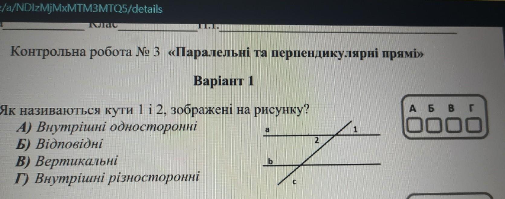 А Б В Г ОООО 2 1. Як називаються кути 1 і 2, зображені на рисунку? 1 А) Внутрішні односторонні Б) Відповідні В) Вертикальні Г) Внутрішні різносторонні