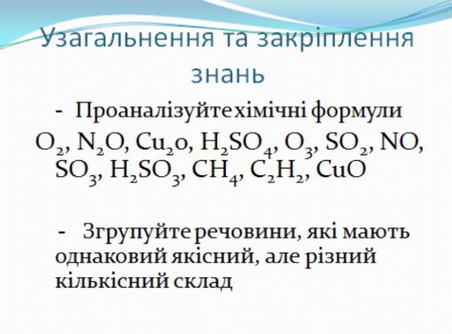 1. кислород, вода, оксид меДи, Тиопероксид водорода, голубой газ, диоксид углерода, оксид азота, оксид серы, сернистая кислота, метан, ацитилен, оксид меди(II)