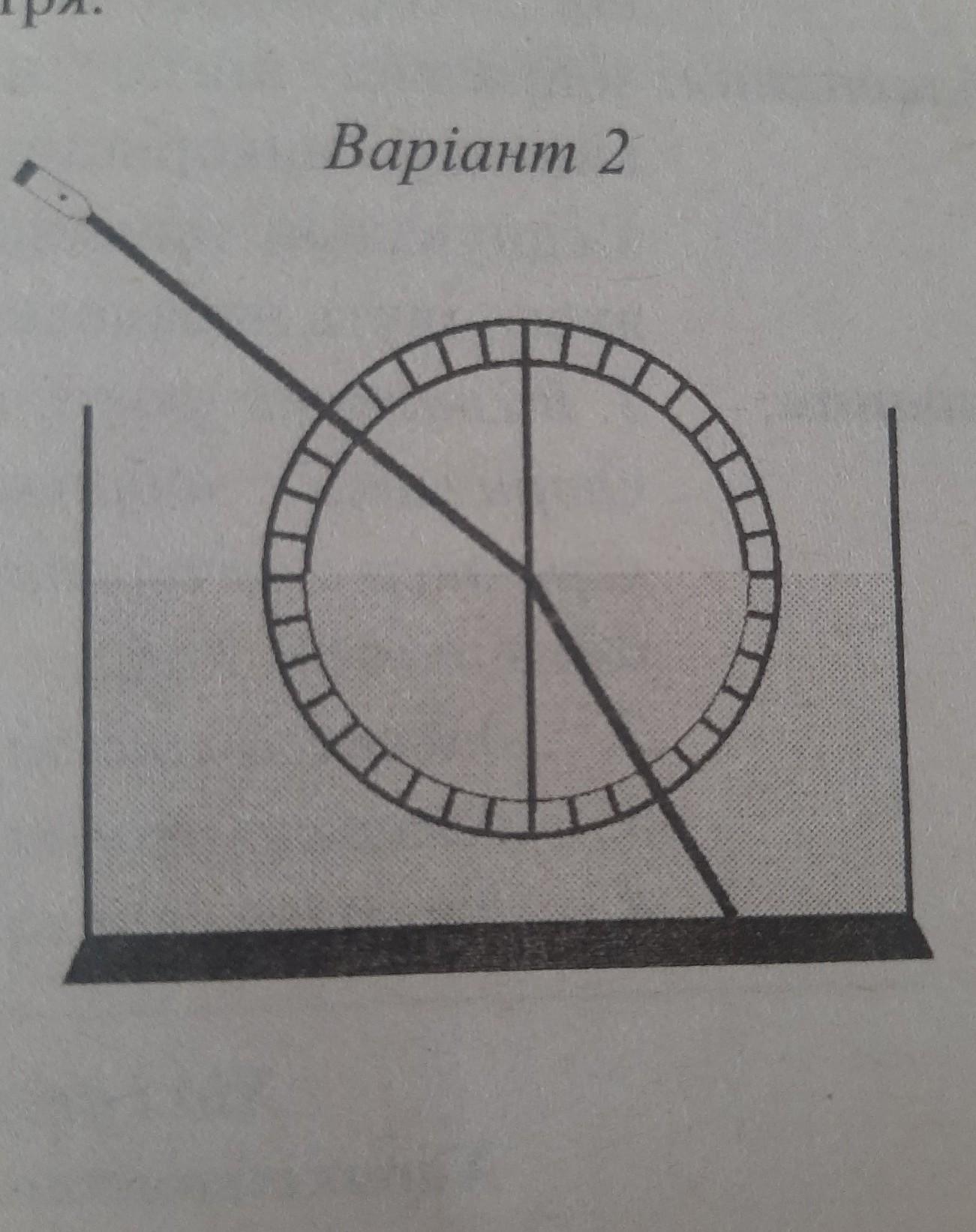 Контрольні запитання У акваріум з рідиною помістили пластиковий круг. На середину круга спрямували промінь від лазерної указки (мал. 16). Визначте за малюнком показник заломлення рідини відносно повітря Варiант 2