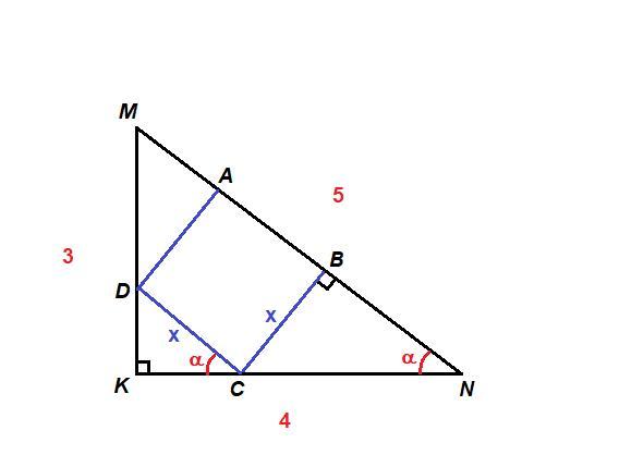 Вася верно нашёл и представил в виде несократимой дроби площадь квадрата ABCD, у которого вершины A и B лежат на стороне MN=5, C – на стороне NK=4, D – на стороне KM=3 треугольника KNM. Укажите числитель полученной Васей несократимой дроби.