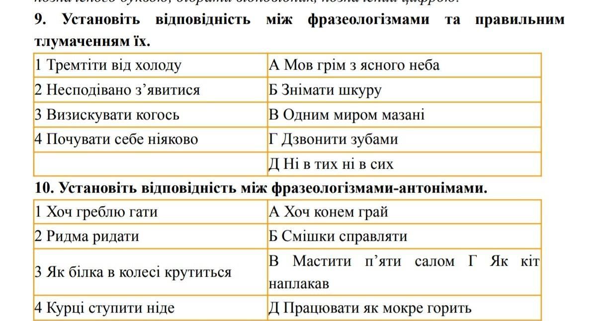 9. Установіть відповідність між фразеологізмами та правильним тлумаченням ïх. 1 Тремтіти від холоду 2 Несподівано з'явитися 3 Визискувати когось 4 Почувати себе ніяково Г А Мов грiм з ясного неба Б Знімати шкуру в Одним миром мазані Дзвонити зубами Д Нi в тих ні в сих 10. Установіть відповідність між фразеологізмами-антонімами. 1 Хоч греблю гати 2 Ридма ридати 3 Як білка в колесi крутиться 4 Курці ступити ніде А Хоч конем грай Б Смішки справляти в Мастити наплакав Pi^ prime салом Г Д Працювати як мокре горить Як кіт