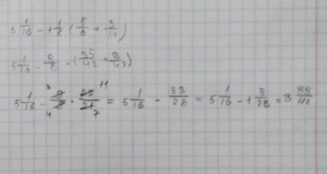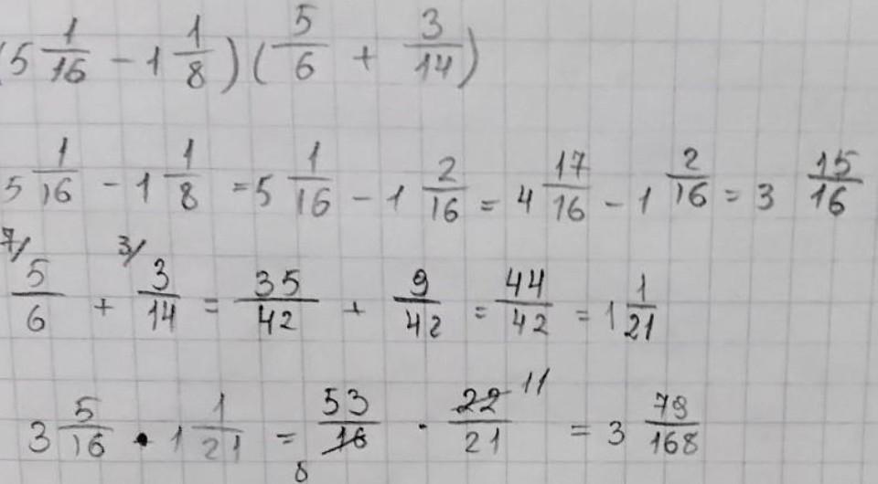1) ( 5 1/16 - 1 1/8 ) (5/6 + 3/14)