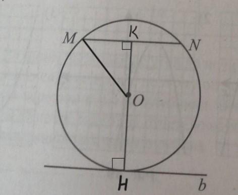 1) Смотрим. Имеем параллельные прямые MN и b, секущую КН. По свойству радиуса (ОН), проведённого в точку касания, ОН перпендикулярен прямой b. Поскольку нам дана параллельность MN и b, можем утвержать, что угол МКО также, как и угол между радиусом и касательной, равен 90°, ведь они односторонние, в сумме дают 180°. Вот мы и обнаружили наш перпендикуляр...