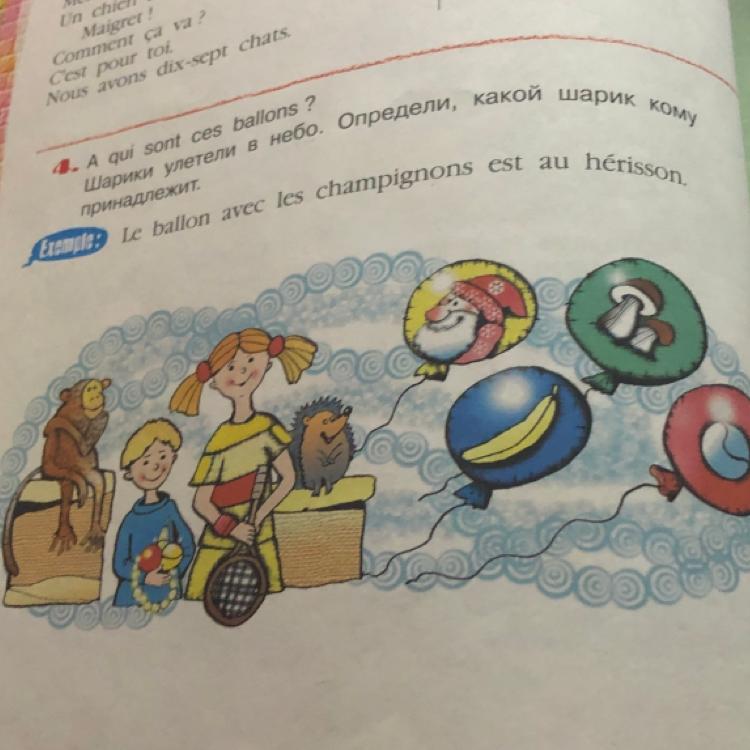 Ответ:La boule bleue appartient au singe. La boule jaune appartient au garçon. La boule verte appartient au hérisson. La boule rouge appartient à la fille.
