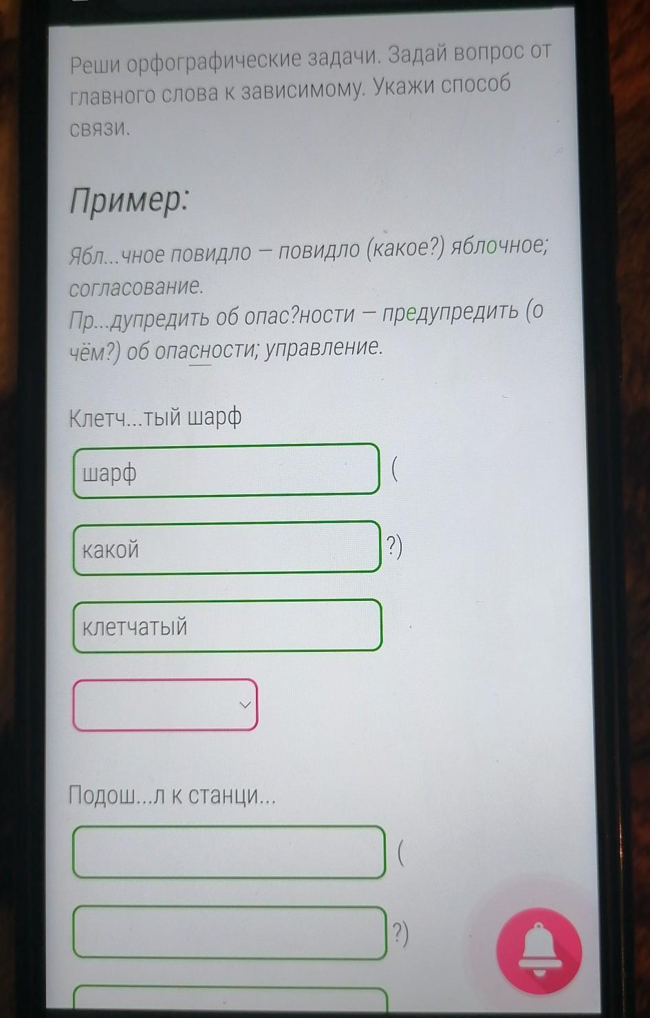 Реши орфографические задачи. Задай вопрос от главного слова к зависимому. Укажи способ СВЯЗИ, Пример: Ябл... чное повидло — повидло (какое?) яблочное; согласование. Пр...дупредить об опас?ности — предупредить (о чём?) об опасности; управление. Клетчтый шарф ?) L