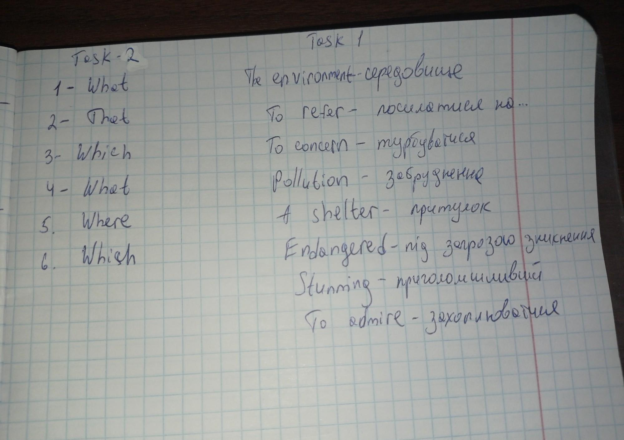 Translate into Ukranian: 1. The environment – 2. To refer – 3. To concern – 4. Pollution – 5. A shelter – 6. Endangered – 7. Stunning 8. To admire –