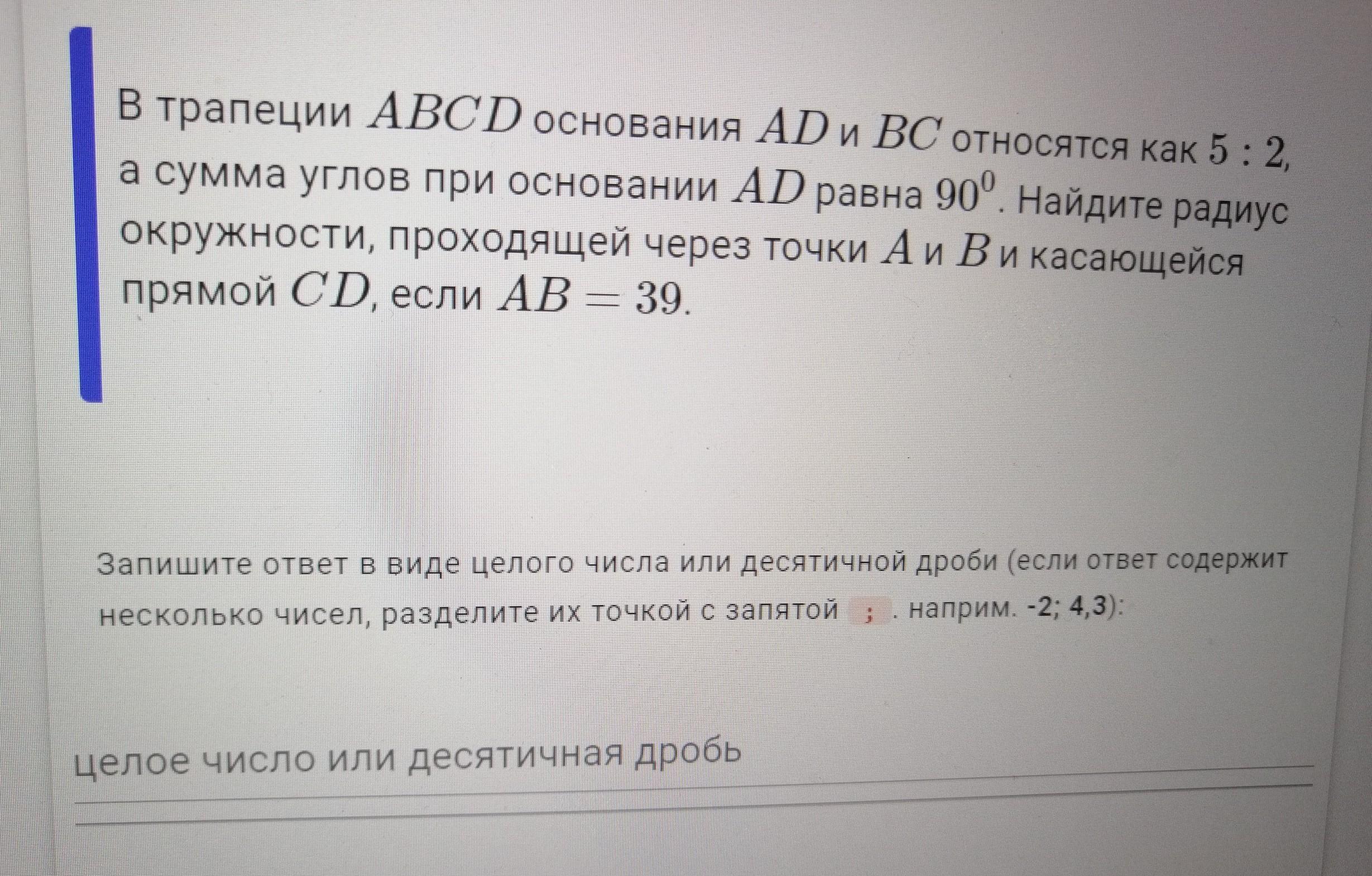 в трапеции ABCD основания AD и BC относятся как 5:2,а сумма углов при основании AD равна 90°.Найдите радиус окружности, проходящей через точки A и B и касающийся прямой CD, если AB=39