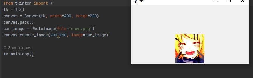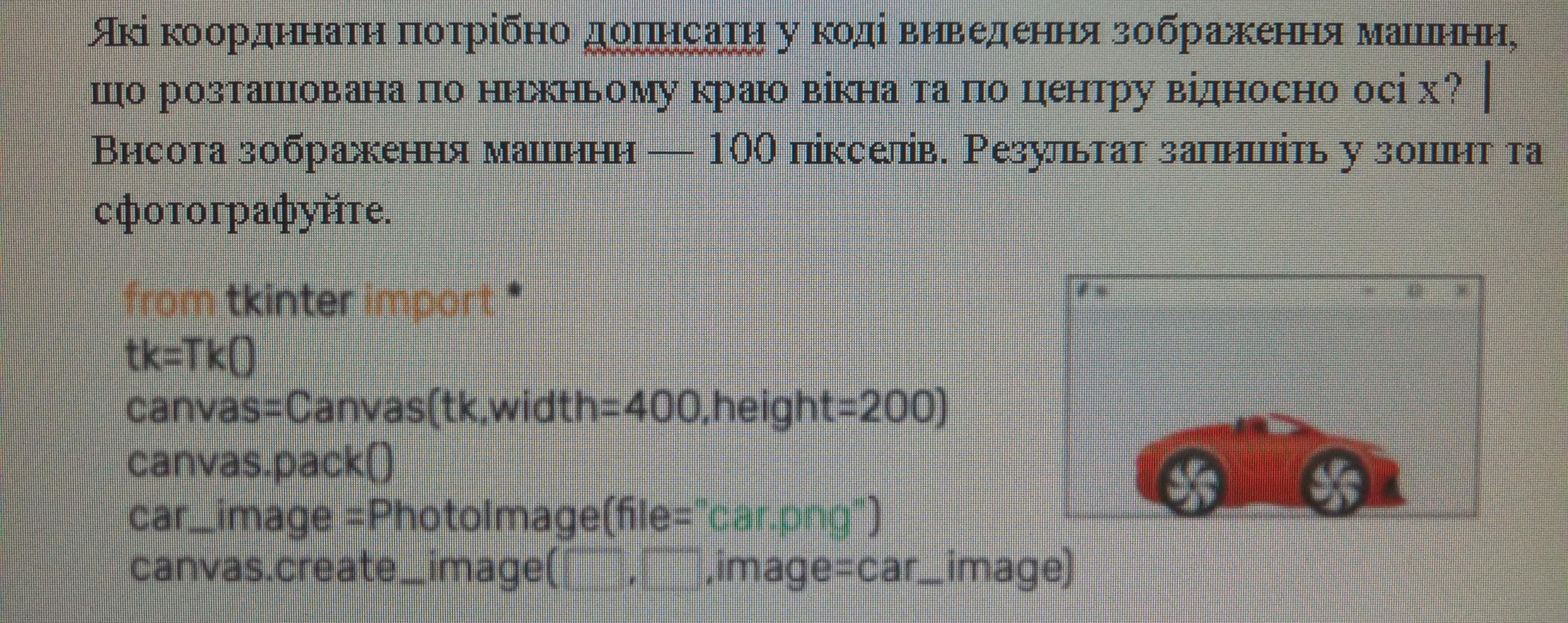 Які координати потрібно дописати у коді виведення зображення машини, що розташована по нижньому краю вікна та по центру відносно осі x? Висота зображення машини — 100 пікселів. Результат запишіть у зошит та сфотографуйте.