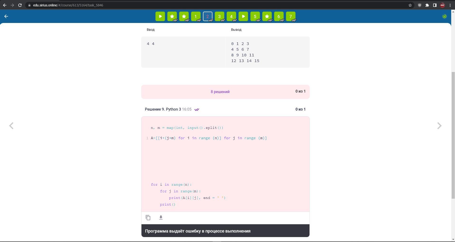 В компиляторе Python всё верно, всё соответсвует данным вывода, но в Сириус данное решение не проходит(Пишет: Программа выдаёт ошибку в процессе выполнения)