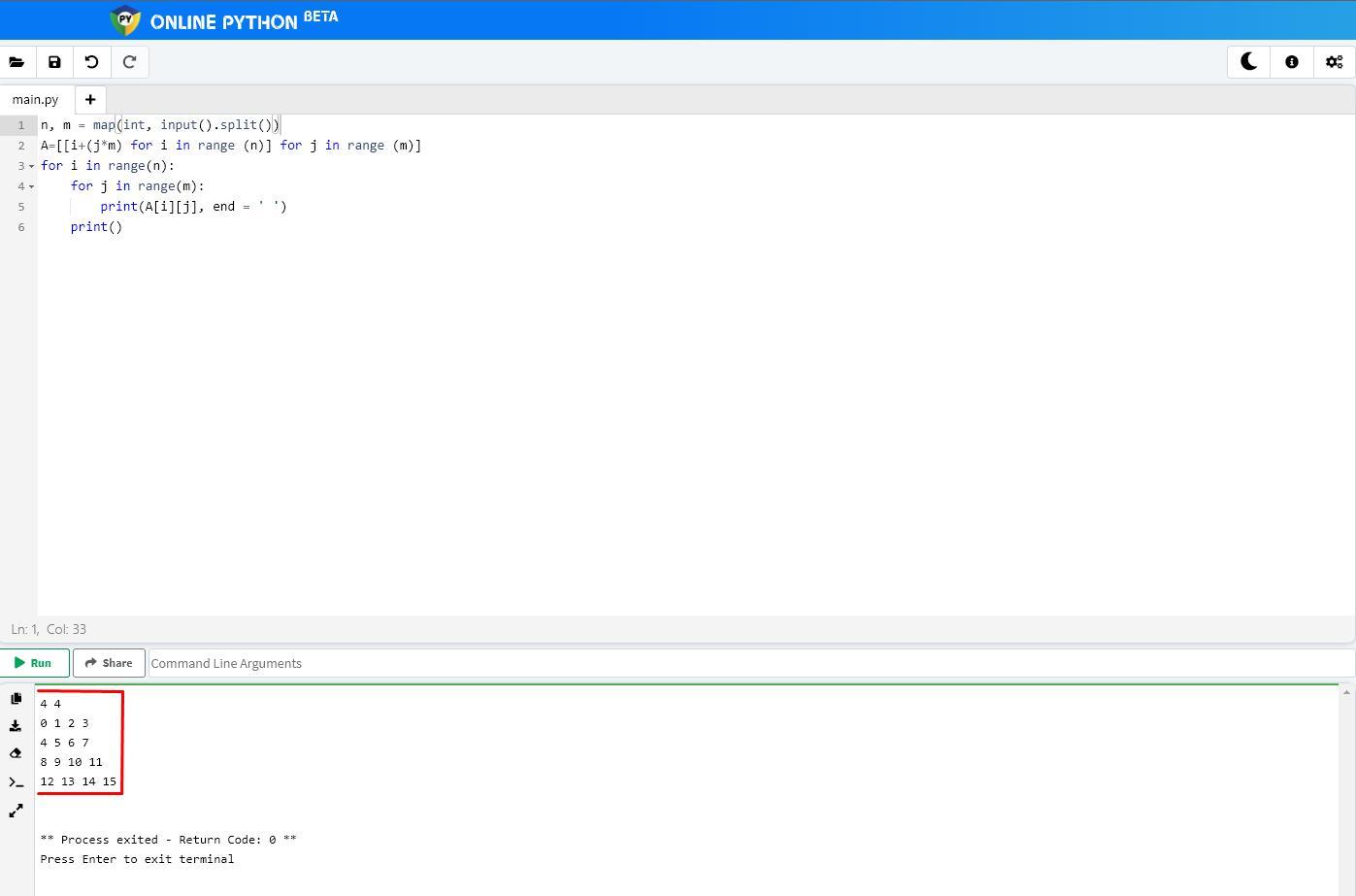 A=[[i+(j*m) for i in range (n)] for j in range (m)]