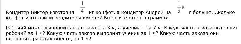1) 1/4 + 1/5 = 5/20 + 4/20 = 9/20 (кг) - изготовил кондитер Андрей