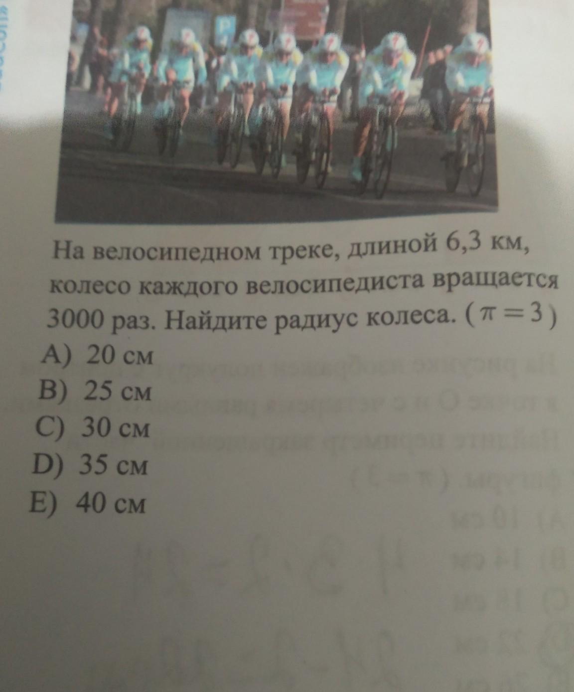 2 На велосипедном треке, длиной 6,3 m, колесо каждого велосипедиста вращается 3000 раз. Найдите радиус колеса. (пи= 3 )А) 20 см В) 25 см C) 30 см D) 35 см E) 40 см