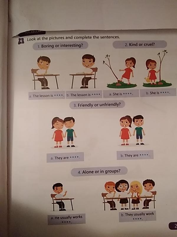 Ответ: 1) boring, interesting 2) cruel kind 3) friendly unfriendly 4) alone in groups