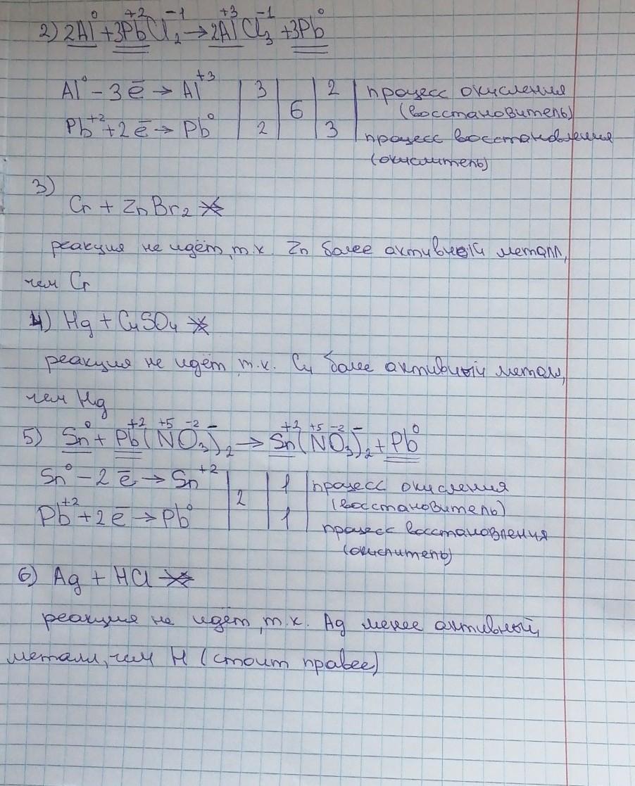 1) Zn + HCI 2) Al + PbCl2 3) Cr + ZnBr2 4) Hg + CuSO4 5) Sn + Pb(NO3)2 6) Ag + HCI