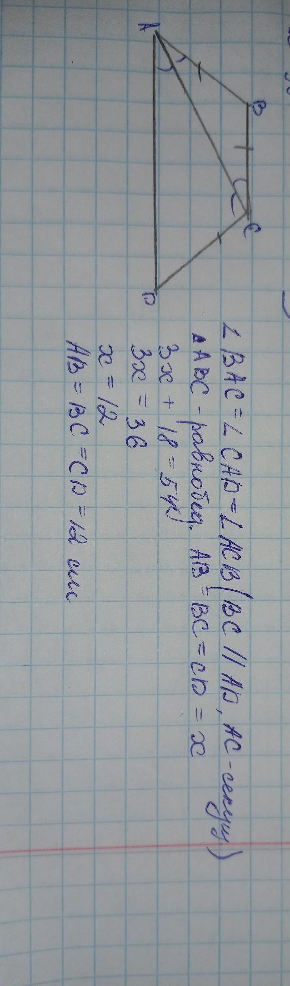 Більша основа рівнобічної трапеції дорівнює 18 м, а її діагональ є бісектрисою гострого кута трапеції. Знайдіть меншу основу трапеції, якщо її периметр 54 см.
