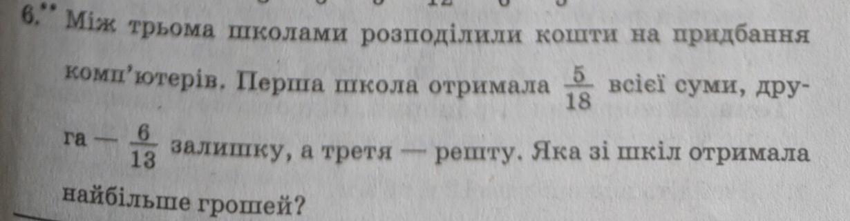 Між 3 школами розподілили кошти на придбання комп‘ютерів,Перша школа отримала 5/18 всієї суми, друга 6/13 залишку , а 3 решту. Яка зі шкіл отримала найбільше грошей.