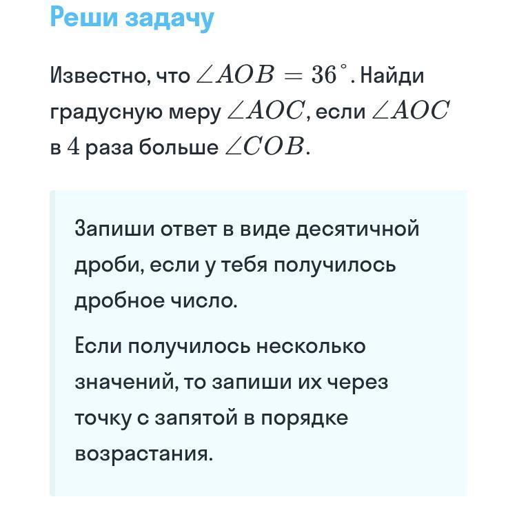 известно что угол аов равен 36 градусов.найди градусную меру угла аос если угол аос в 4 раза больше угла сов