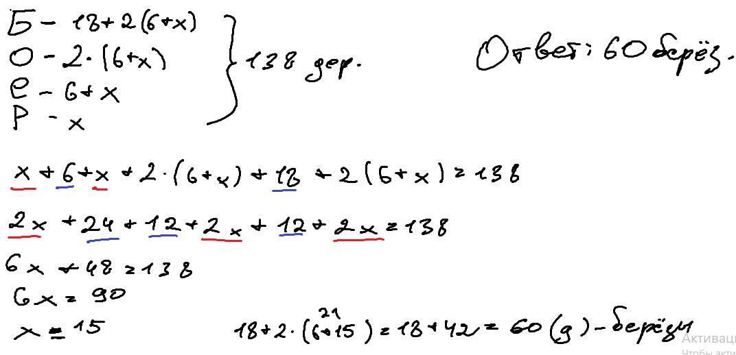 Зная, что всего в парке растёт 138 деревьев, составим уравнение: