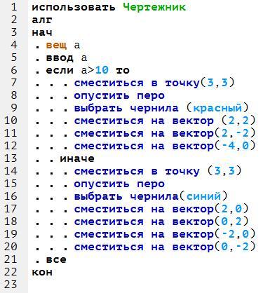 Если переменная a=10, то условие в строке 6 (a>10) не выполнится, программа перейдет к строке 14, и нарисует синий квадрат размером 2*2, с нижней левой вершиной, находящейся в точке 3,3.