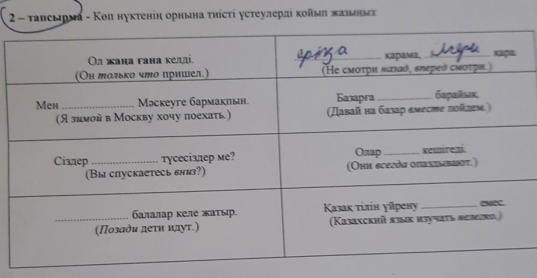 мен қыста Мәскеуге бармақпын. Сіздер төменге түсесіздерме? Артта балалар келе жатыр . Артқа қарама, алдыға қара. Базарға бірге барайық. Олар үнемі кешігеді. Қазақ тілін үйрену оңай емес.