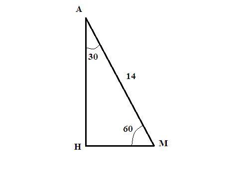 AH - перпендикуляр к плоскости a. АМ - наклонная. МH - проекция наклонной. Найти: MH, AH, если АМ = 14 см. и угол АМH = 60°