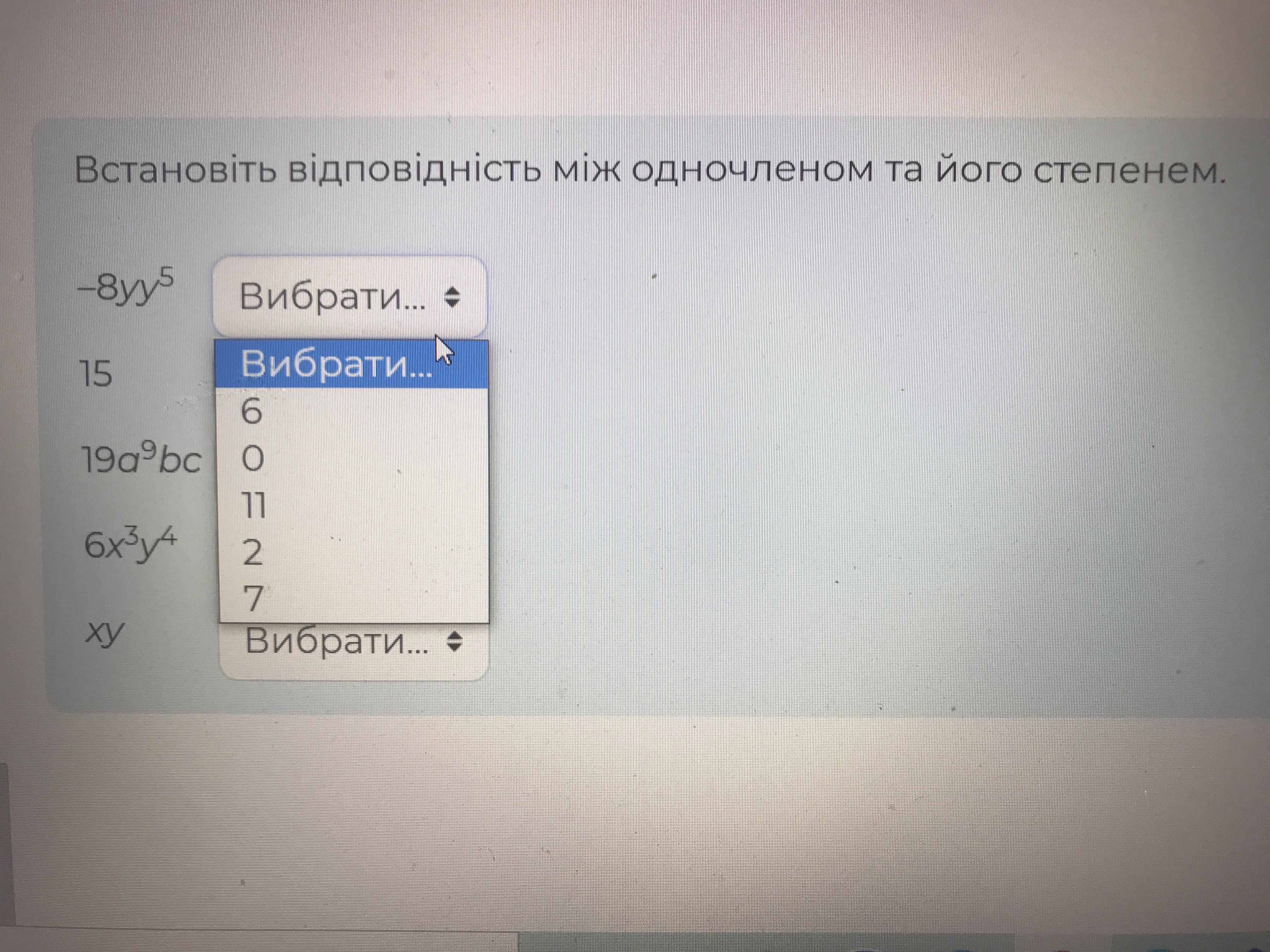Установите соответствие между одночленом и его степенью (это на Руском)