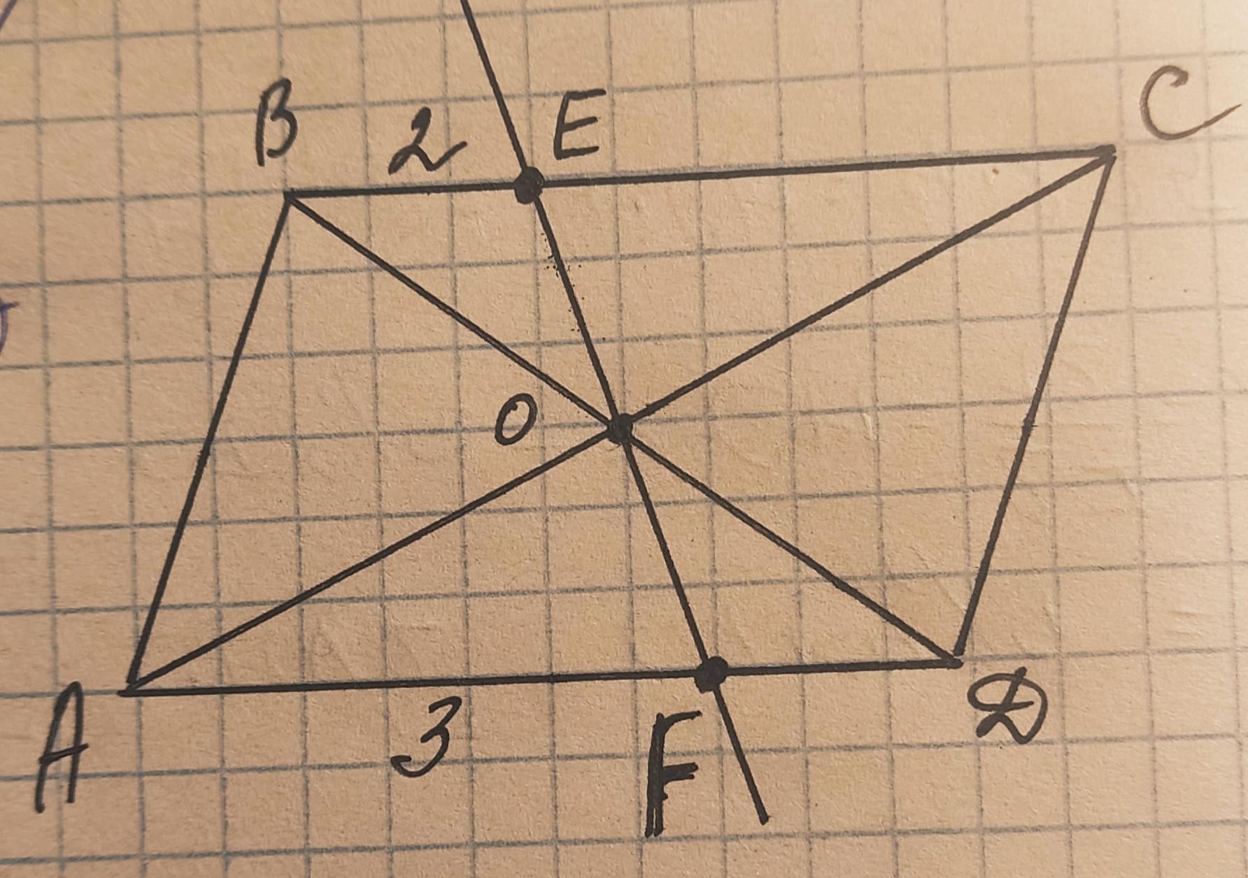 Впараллелограмме АВСD через точку пересечения диагоналей проведена прямая, которая отсекает на сторонах ВС и АD отрезки BE=2 и AF=3. Найдите сторону ВС