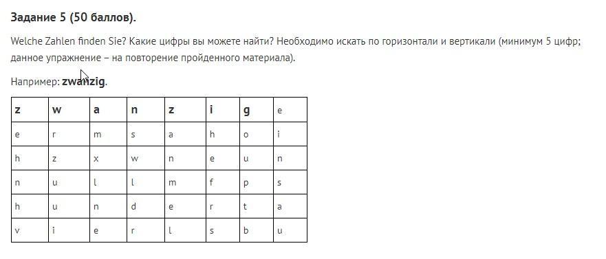 Welche Zahlen finden Sie? Какие цифры вы можете найти? Необходимо искать по горизонтали и вертикали (минимум 5 цифр; данное упражнение – на повторение пройденного материала).