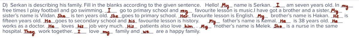 D) Serkan is describing his family. Fill in the blanks according to the given sentence. Hello! ____ name is Serkan. ____ am seven years old. In ____ free times I play football and go swimming. ____ go to primary school and ____ favourite lesson is music.I have got a brother and a sister.____ sister’s name is Vildan. ____ is ten years old. ____goes to primary school. ____ favourite lesson is English. ____ brother’s name is Hakan. ____ is fifteen years old. ____goes to secondary school and ___ favourite lesson is history. ____ father’s name is Kemal. ____ is 38 years old. ____ works as a doctor. ____ loves ____ job very much. ____ patients also love ____ . ____ mother’s name is Melek. ____ is a nurse in the same hospital. ____ work together. ____ love ____ family and ____ are a happy family.