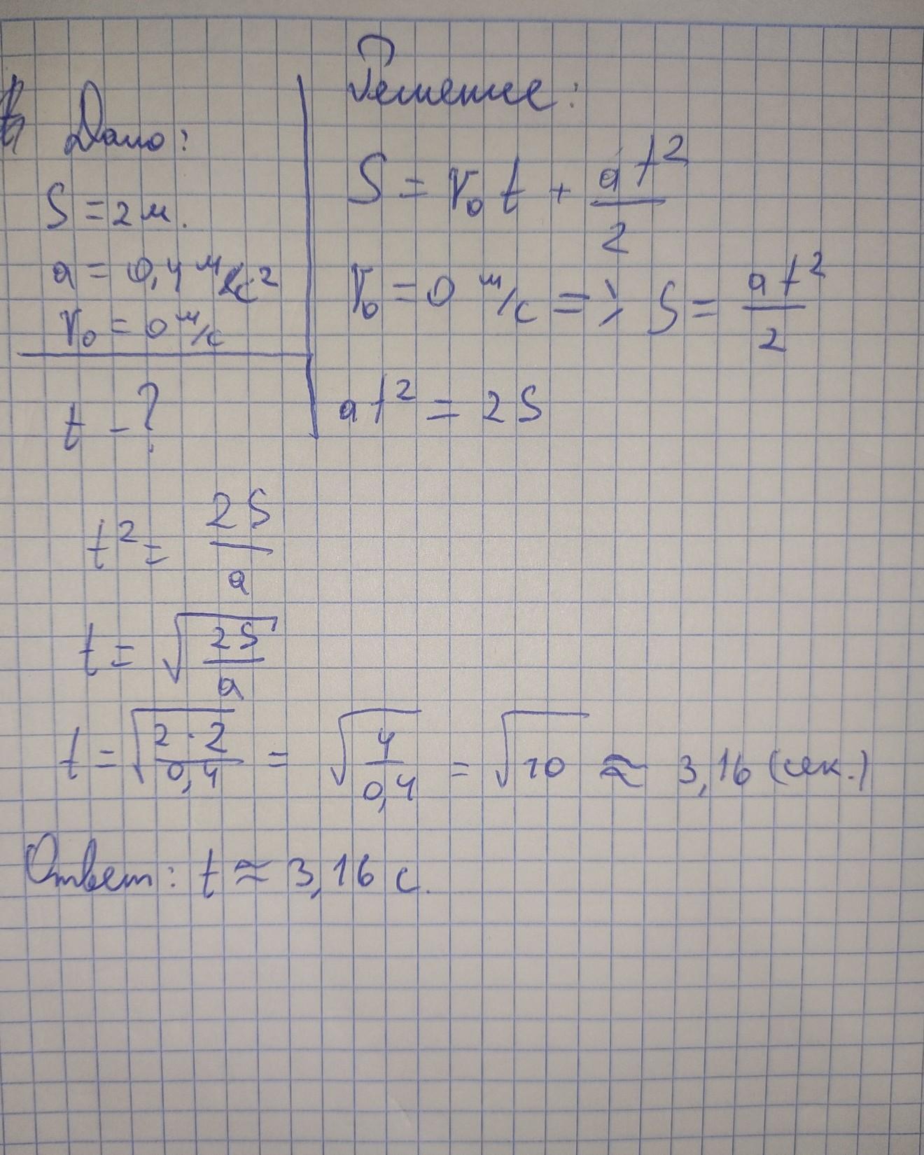 Сколько времени будет двигаться шарик без начальной скорости с ускорением 0,4 м на секунду в квадрате если длина желоба 2 м