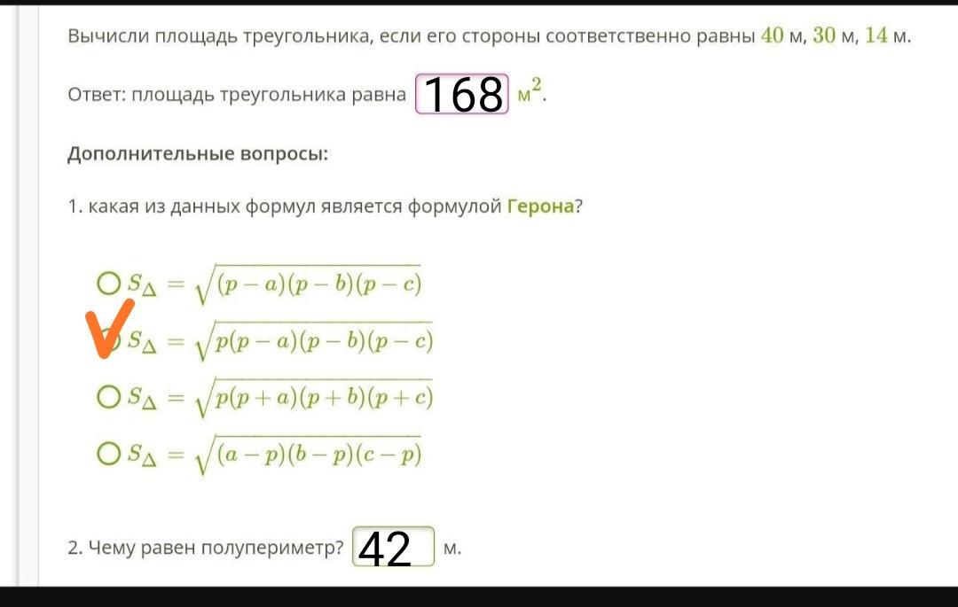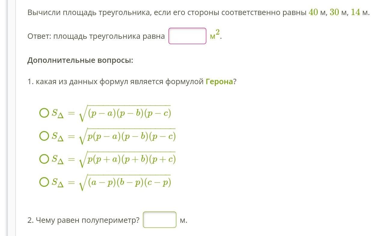 Вычисли площадь треугольника, если его стороны соответственно равны 40 м, 30 м, 14 м.