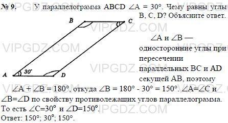 противоположные углы параллелограмма равны ⇒ ∡А=∡С=30°;