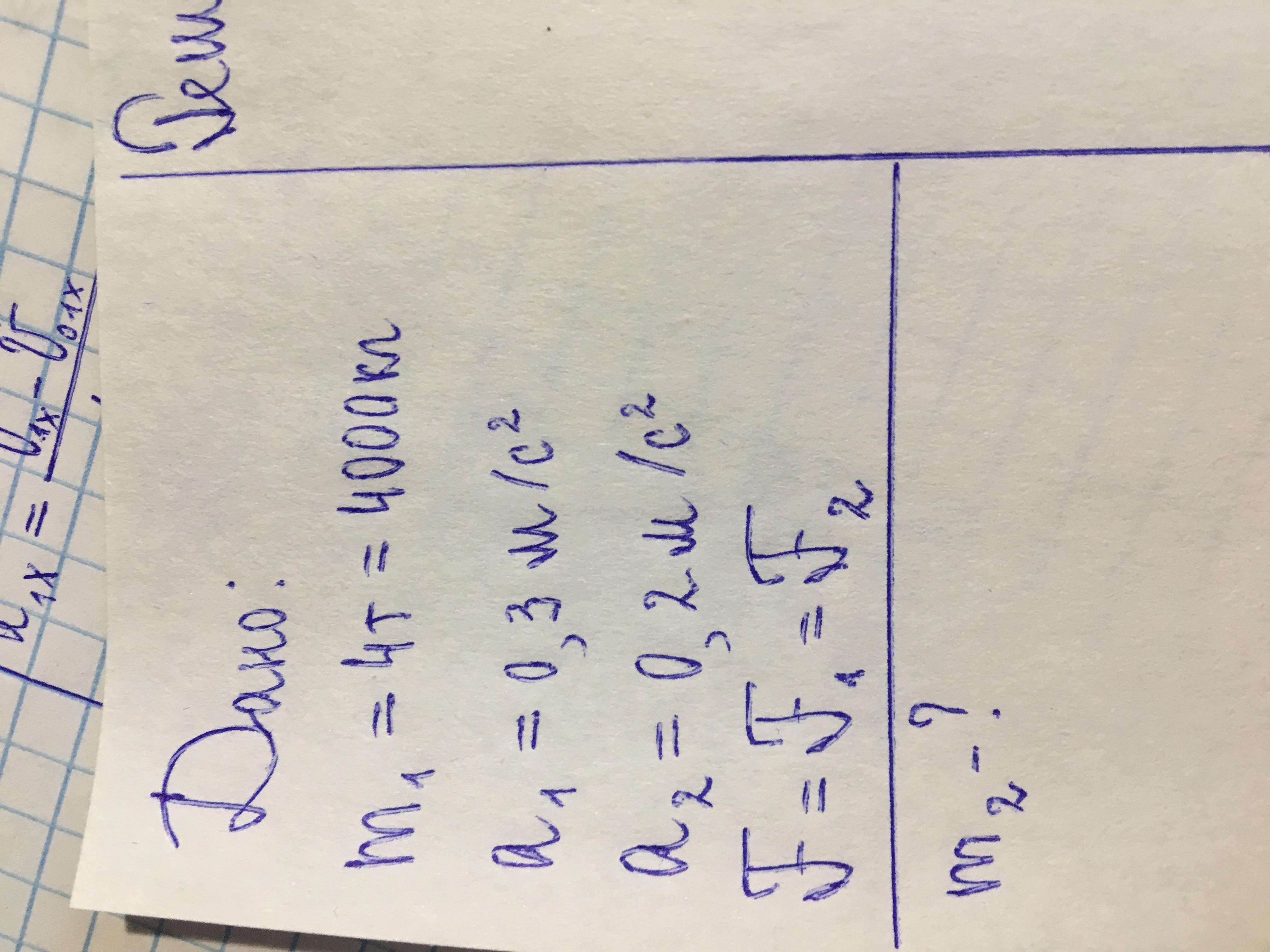 F1=m1a1. F2=m2a2. m1a1=m2a2=> m2=(m1*a1):a2=( 4000*0,3):0,2=6000 кг