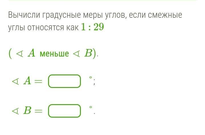 пусть < А = х ; < В = 29х ; < А + < В = 180° → х + 29х = 180 ; 30х = 180 ; х = 180 ÷ 30 ; х = 6 → < А = х = 6° ; < В = 29х = 29 · 6 = 174° .