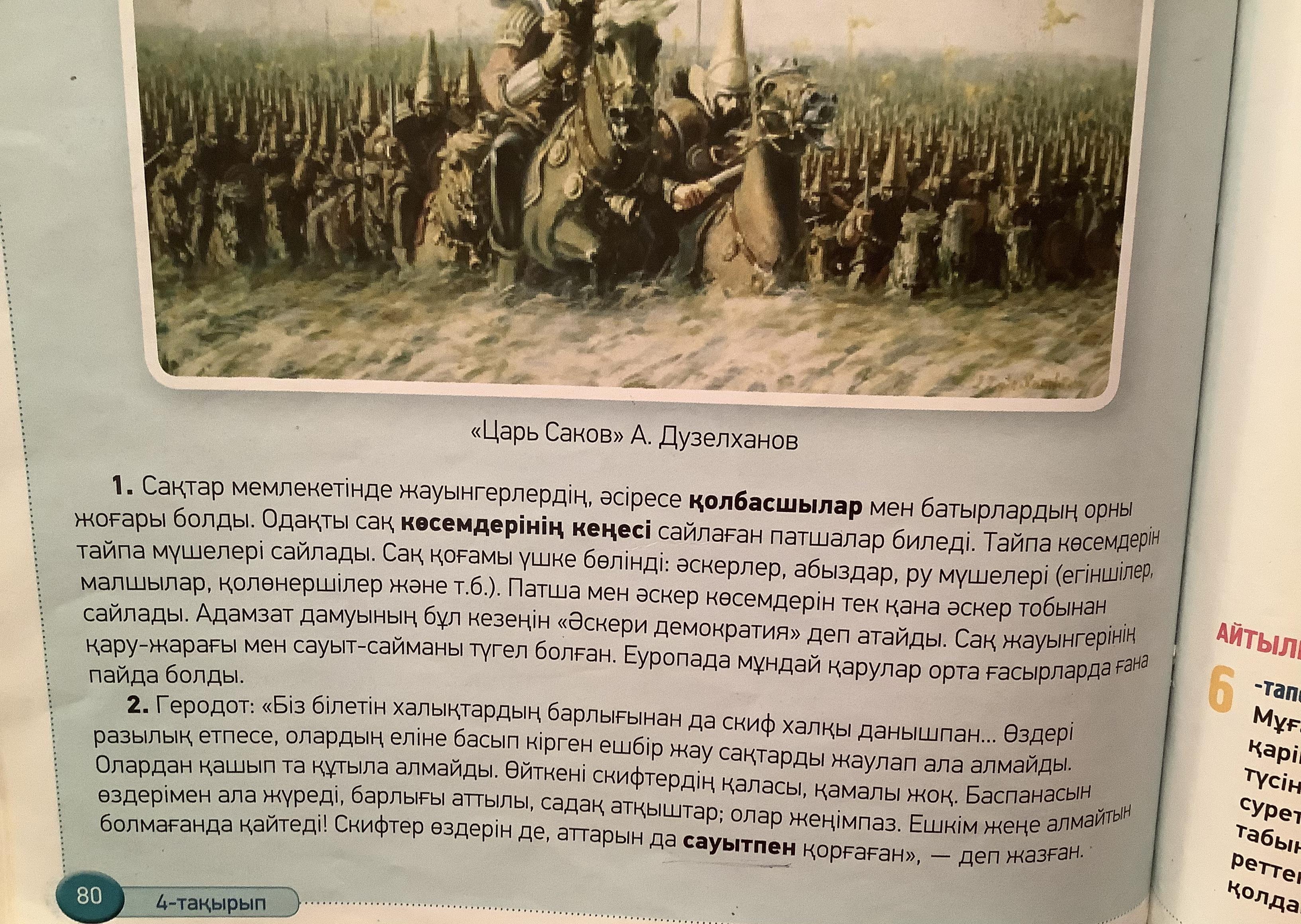 Өйткенi скифтердiн каласы , камалы жок . Өздері разылып , оларды еліне басып кірген ешбір жау сактарды жаулап ала алмайды Олардан қашып та кұтыла алмайды . Ешком нене алма Болмаганда кайтедi ! Скифтер ездерiн де , аттарында сауытпен коркаган , - деп жазган