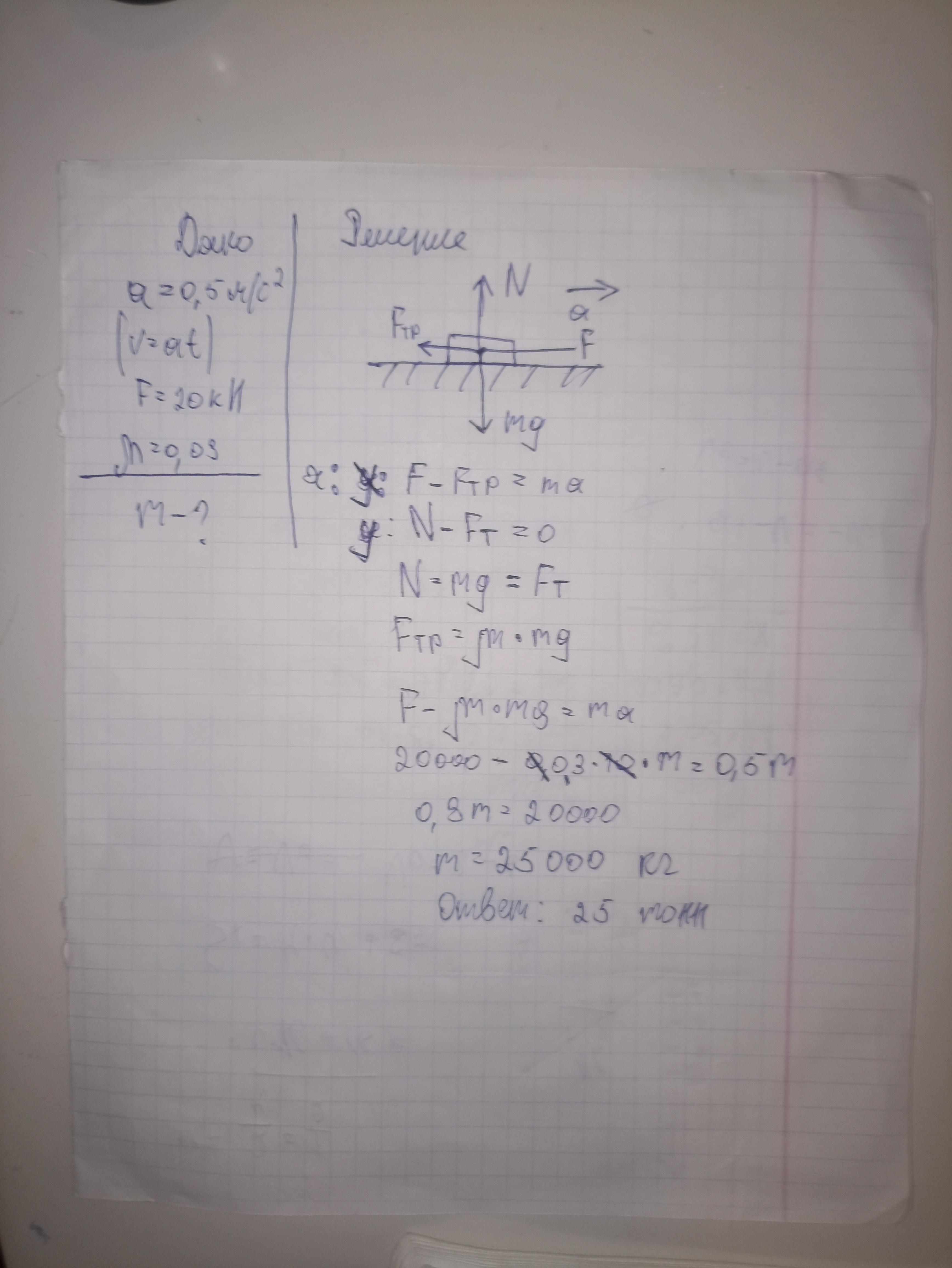 Найдите массу автобуса, который, движется так, что его проекция скорости на направление движения изменяется по закону vx=0.5t. Если сила тяги равна 20кН, а коэффициент трения движения равен 0,03